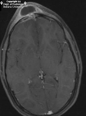 Rim-enhancing fluid collection in superficial scalp.